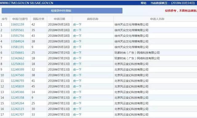 隨手一搜“皮一下”三字,竟然高達44條商標申請記錄。其中,北京一家公司20多個類別,申請用于玩具、包、廣告等商品或服務。