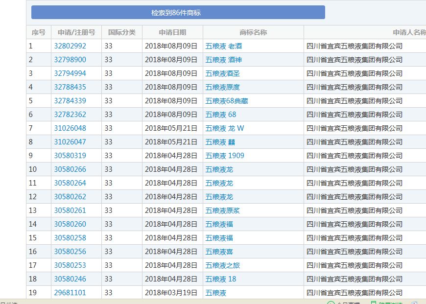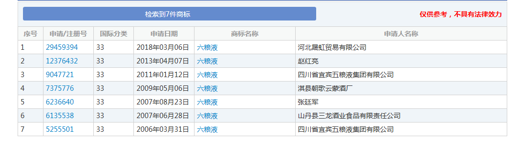 前兩天,邊肖在中國商標局官網(wǎng)查詢。結(jié)果她驚喜地發(fā)現(xiàn)“六糧液”,而且已經(jīng)進入初審公告期。在查詢33種白酒商標時,檢索到以下7條信息,均注冊為“六糧液”商標。只有兩條信息顯示“六糧液”商標的申請人為五糧液集團,其余均為他人申請。