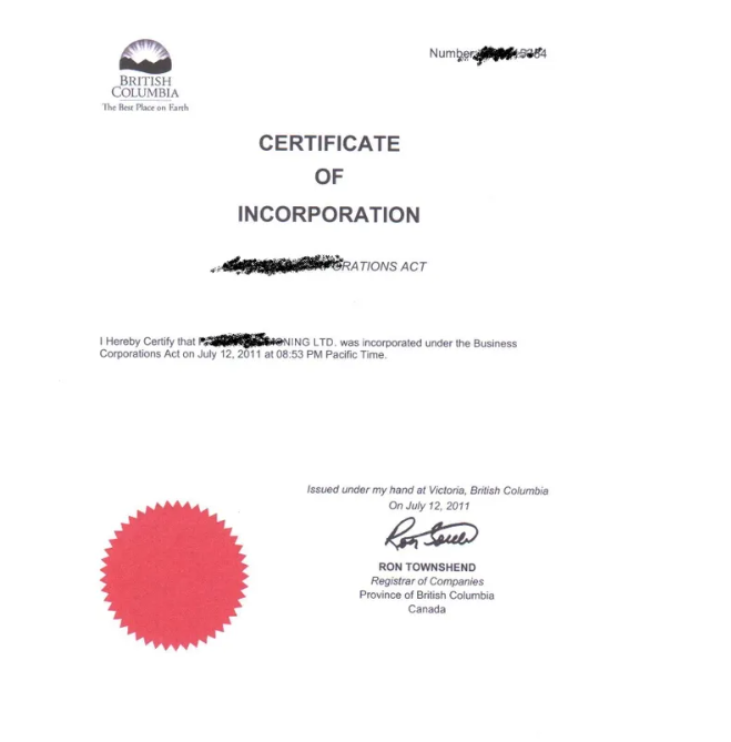 (加拿大公司注冊證書樣本)